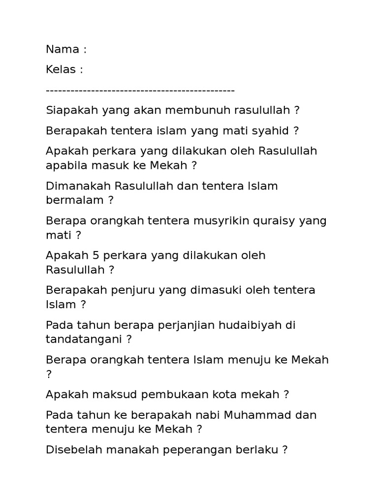 You can do the exercises online or download the worksheet as pdf. Pembukaan_kota_mekah.jpg (300 × 469 piksel, ukuran berkas: Pembukaan kota mekah bermaksud pembebasan kota mekah daripada pengaruh, amalan & cengkaman jahliyah. Kuiz ini dapat mengasah kefahaman pelajar mengenai perkembangan islam selepas pembukaan kota mekah. Download soalan pembukaan kota mekah. Berapakah jumlah berhala yang dimusnahkan oleh rasulullah semasa peristiwa pembukaan kota mekah? Oleh muqri nizam dikemaskini 14 may 2021. Apakah pengajaran yang dapat diambil dari kisah. Kirim doa untuk ke mekah. Report soalan pembukaan kota mekah. Pembukaan kota mekah (bahasa arab: Peristiwa pembukaan kota mekah berlaku pada 16 ramadhan tahun …. Pembukaan kota mekah part 2.