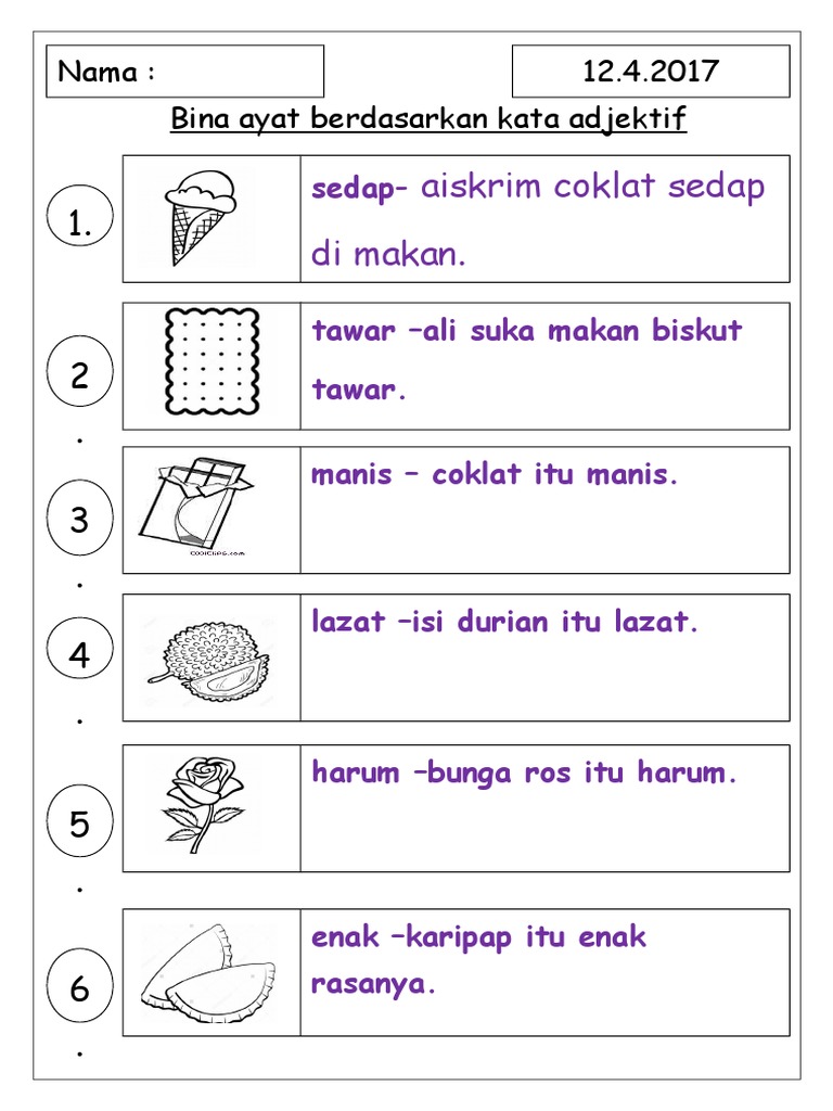 Contoh Soal Dan Materi Pelajaran 8 Contoh Ayat Kata Adjektif Sifat from slideplayer.info Terhasil daripada kata nama , kata kerja , kata adjektif. Kedua, menggunakan kata pemeri adalah dalam struktur ayat yang tidak sepatutnya menggunakan sebarang kata pemeri. Pelajar dan guru dapat memanfaatkan penggunaan ict bagi memberikan impak kualiti yang baik dalam pembelajaran pada masa kini. 1) dia sangat bijak berpidato. Apr 26, 2014 · jenis kata adjektif contoh perkataan ayat a) adjektif sifat: Mar 16, 2016 · contoh menunjukkan 'perbezaan. Ayat ini juga dikenali sebagai ayat selapis. 。 koleksi soalan dan latihan bahasa melayu tahun 4 + jawapan.