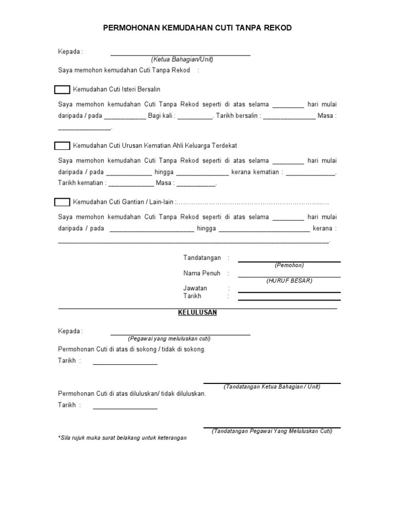 Kelayakan Cuti Tanpa Rekod - Tandatangan & cop ketua jabatan / unit kelulusan pengarah permohonan cuti tanpa rekod ini :. Cuti menghadiri perbicaraan mahkamah di luar stesen. Rawatan di luar stesyen a. Bermula tahun ini, pegawai perkhidmatan awam beragama hindu diberikan kemudahan cuti tanpa rekod selama satu hari, sehari selepas cuti umum hari deepavali. Cuti keagamaan tertakluk kepada maksimum tujuh (7) hari, tidak termasuk hari rehat mingguan, hari kelepasan mingguan dan. Kemudahan cuti kuarantin ini diperluas kepada pegawai yang anaknya menghidap penyakit berjangkit dan perlu dikuarantin.