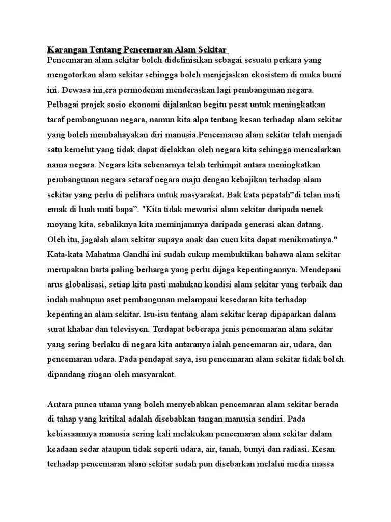A ) pencemaran air b ) pencemaran tanah. Sumber air akan menjadi kotor dan beracun dan tidak boleh digunakan. Feb 15, 2014 · selain itu,pemeliharaan dan pemuliharaan alam sekitar amat penting agar manusia mendapat sumber air yang bersih dan tidak tercemar. Keadaan pemanasan global sejak 1900 yang ternyata tidak seperti yang diprediksi disebabkan penyerapan panas secara besar oleh lautan. Ini membawa kesan yang amat ketara bagi hidupan akuatik. Pemanasan berkelanjutan akhirnya mengatasi kesan ini, sebahagian lagi kerana adanya kawalan terhadap pencemaran yang menyebabkan udara menjadi lebih bersih. Sep 28, 2013 · kepentingan alam sekitar 1. Spesies invasif ditakrifkan sebagai spesies yang bukan asli (alien) kepada ekosistem dan / atau penyebabnya, atau mungkin menyebabkan bahaya sosial, ekonomi, atau alam sekitar. Pencemaran ini wujud sebaik sahaja pembinaan dijalankan. Pencemaran air seperti membuang sampah dan sisa toksik ke dalam sungai dan sebagainya akan memberikan kesan buruk kepada kehidupan manusia. Spesies asli juga boleh menjadi invasif jika mereka menyebabkan kemudaratan oleh kolonisasi dominan ekosistem disebabkan kehilangan kawalan semulajadi (iaitu kehilangan. Oct 04, 2012 · pada bulan november 2002, dasar alam sekitar negara (npe) telah dilancarkan dan kesannya terhadap pengurusan lestari alam sekitar dan sumber asli akan menjadi lebih terserlah.